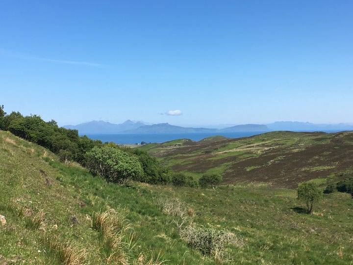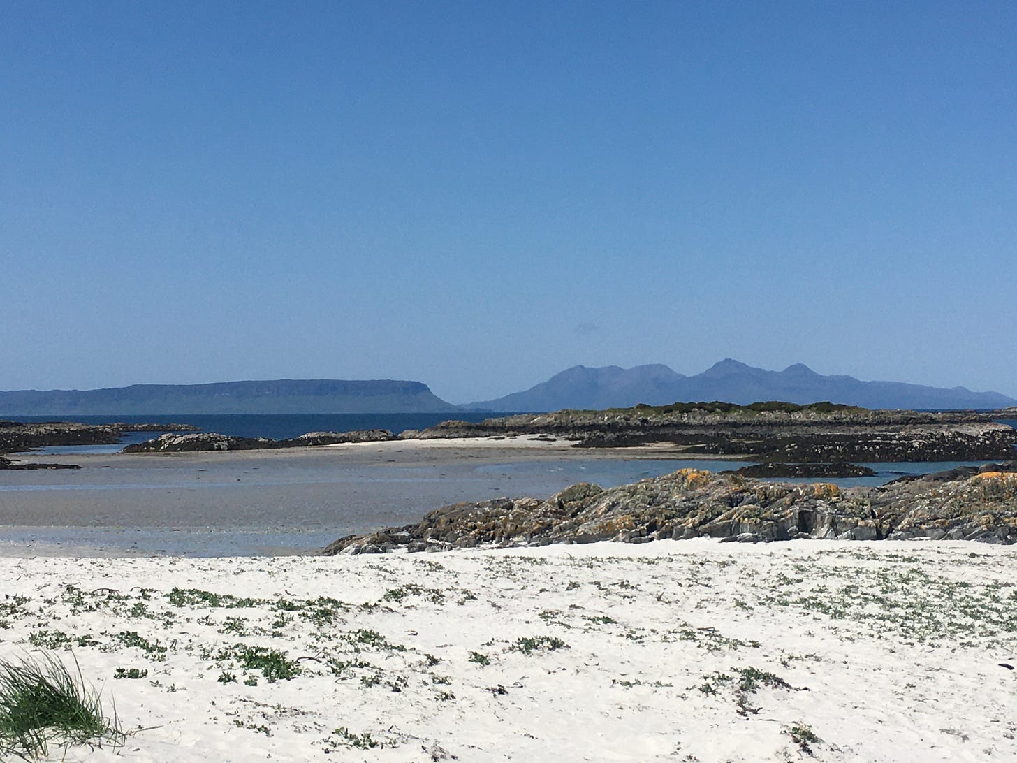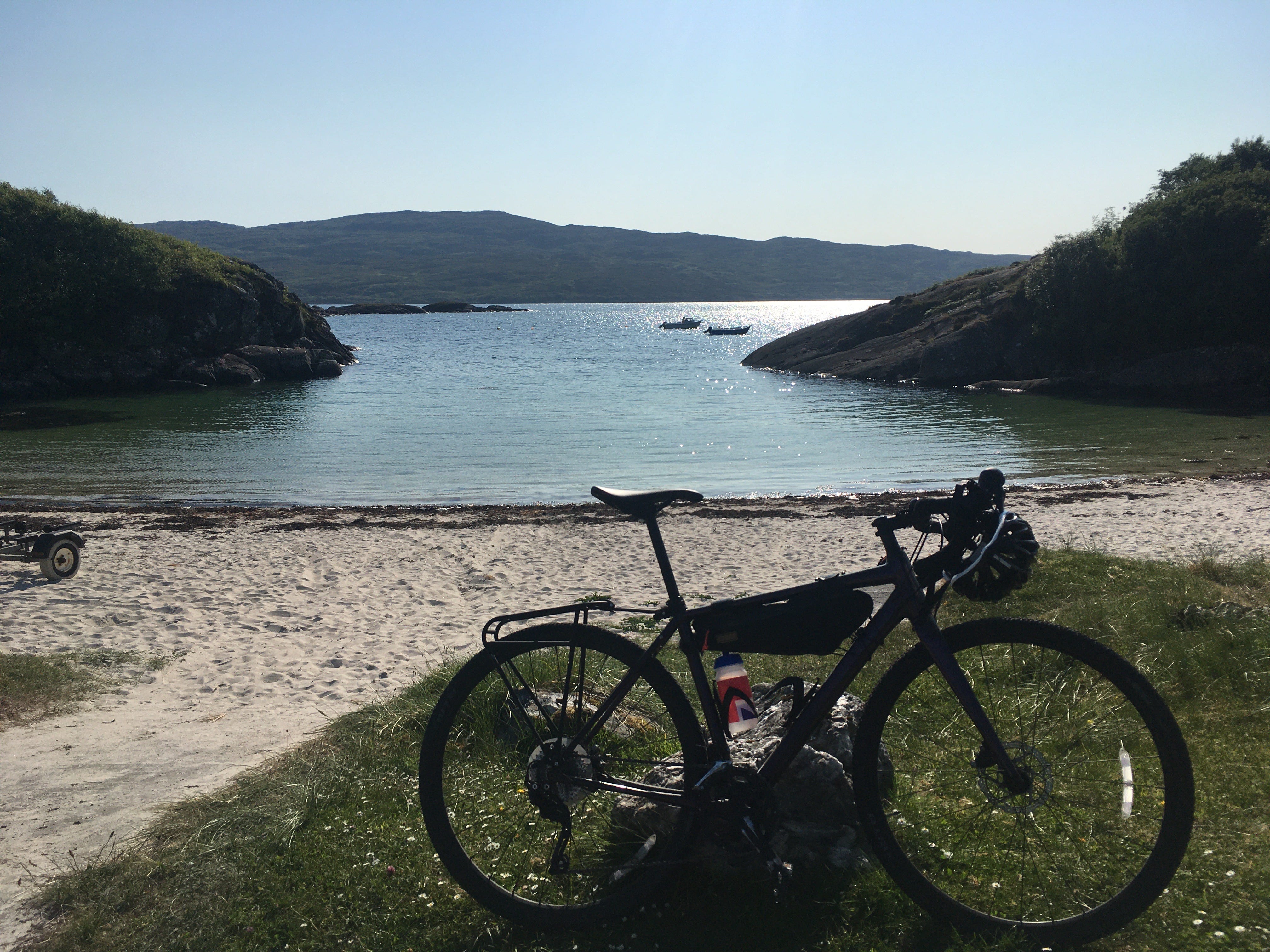 Before leaving Mallaig I stocked up at the local Coop, not knowing where the next shop might be - an inspired move despite the extra weight. On down the west coast past more beautiful white beaches. The picture below shows Eigg to the left - kind of fried egg shape - and Rhum to the right, nothing like a bottle shape. As for Muck, it’s a mere speck.